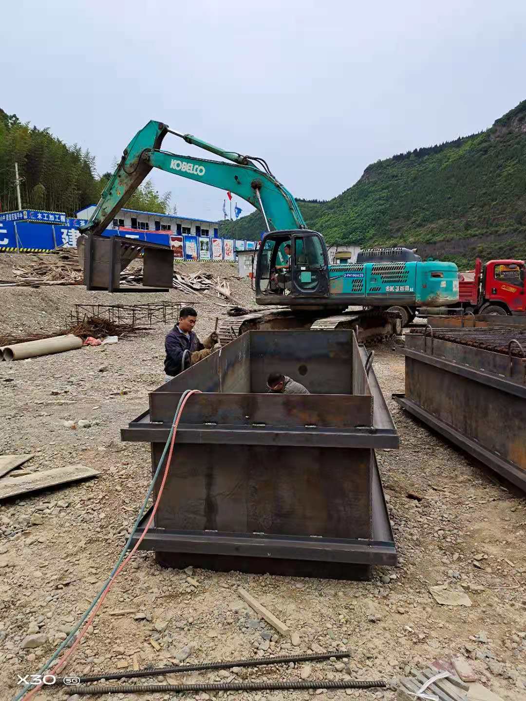 施工步骤:清理河床、挖掘沟槽、放置管道、回填土固定。